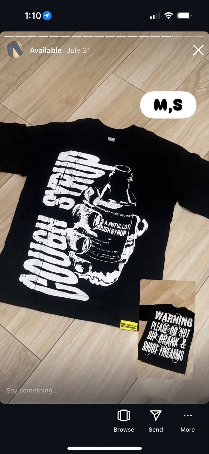 Most Cough Syrup tees are unisex; select measurements by item measurements, not by gendered charts. Restocks are rare and usually limited to certain artwork or colorways, so presume a launch is one-and-done unless the company explicitly announces a second drop.